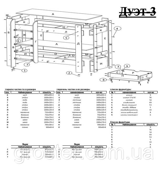 - Спосіб упаковки: Товар продається і доставляються в розібраному вигляді, упакований в заводській гофрокортон. У коробці є інструкція і гарантія 12 міс, фурнітура та ключ для збірки.